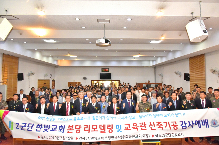 2군단사령부 한빛교회 본당 리모델링 및 교육관 신축 감사예배가 250여 명이 참석한 가운데 7월 12일 (금) 오후 1시 30분 2군단 사령부 한빛교회에서 있었다.