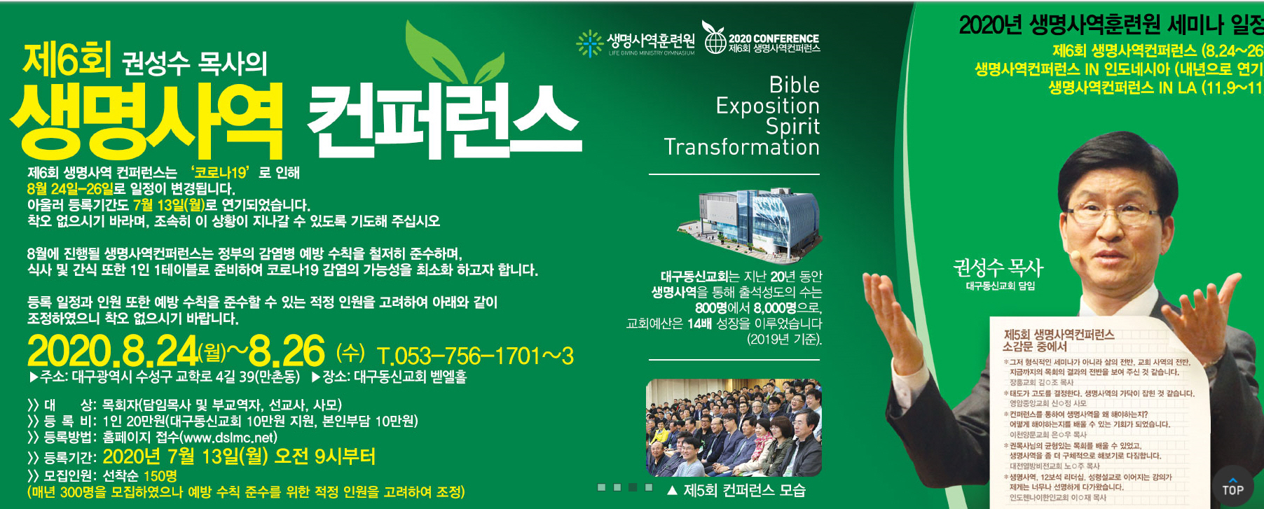 대구동신교회 권성수 목사의 생명사역 컨퍼런스가 8월 24일(월)부터 26일(수)까지 대구동신교회에서 열린다. 등록은 7월 13일(월)까지다. 등록비는 20만 원이다. 그러나 대구동신교회에서 10만 원을 지원하기에 본인부담금은 10만 원이다. ’코로나19’로 인해 정부의 방역수칙을 준수하기 위해 식사와 간식은 1인 테이블로 제공된다.