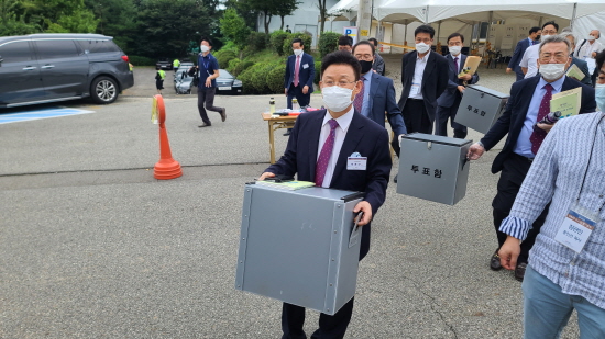 선관위 위원 박춘근 목사와 위원들이 참관인들의 감시 하에 투표함을 옮기고 있다