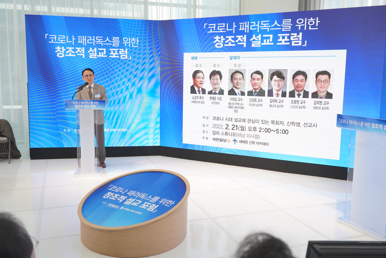 With COVID19 시대를 대비한 설교학 세미나 “코로나 패러독스를 위한 창조적 설교포럼”이 2월 21일 오후 2시부터 5시까지 경기도 하남시 칼라 스튜디어에서 있었다. 코로나 팬더믹 시대에 어떻게 하면 설교가 잘 들리고 볼 수 있을까에 대한 고민에서 나왔다. 포럼은 국민일보와 새에덴신학아카데미에서 주최했다.