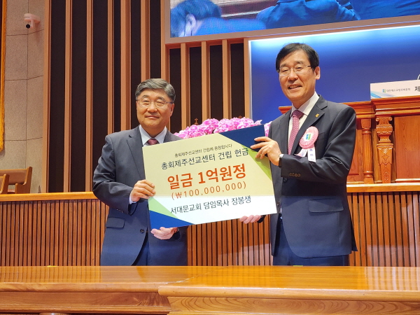 그 속에서도 피어난 꽃처럼 아름다운 이야기가 있었다. 다름 아닌 서대문교회(장봉생 목사)에서 1억 원을 마련해 ‘총회제주선교센터 건립헌금’을 총회장 권순웅 목사에게 전달한 것이다. 첫날 총회장 권순웅 목사가 시무하는 주다산교회에서 1억 원을 헌금했으니, 오는 6월까지 전국교회를 향한 모금운동에 본격적으로 불이 붙을 것으로 보인다.