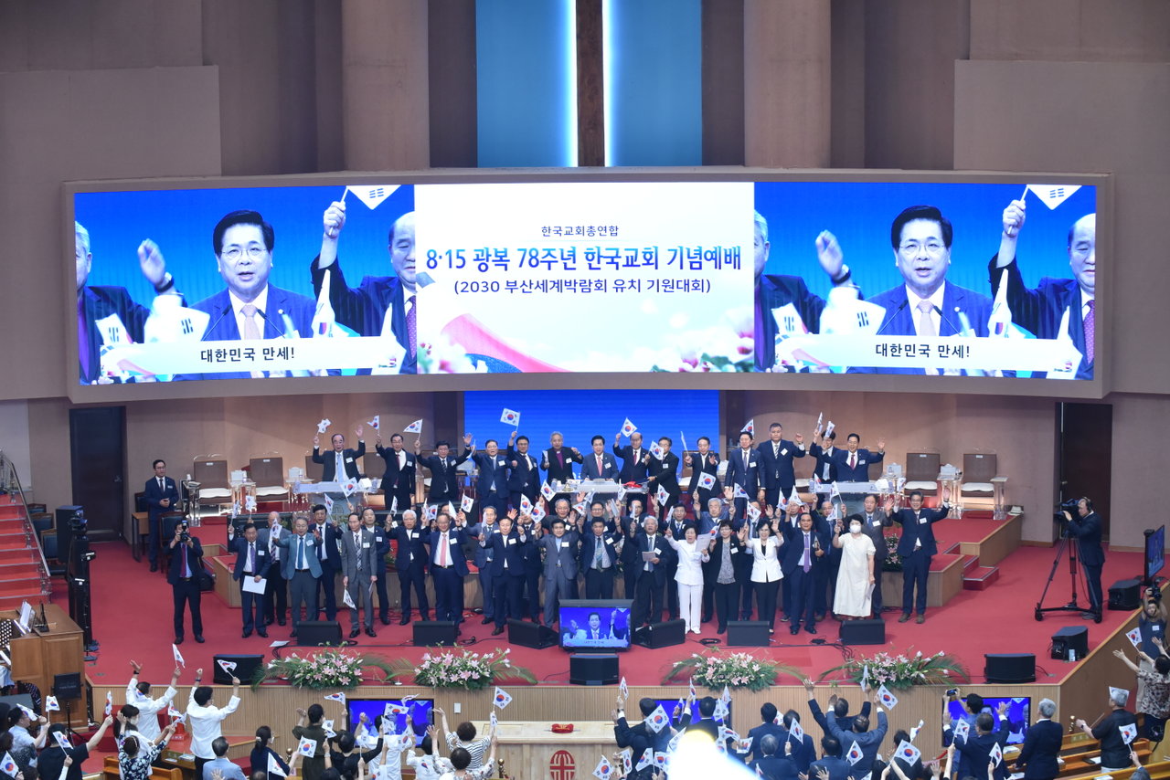 한편 성명서는 낭독은 공동대표회장 송홍도 목사와 기성총회장 임석웅 목사, 개혁개신총회장 임용석 목사이 발표하고, 대표회장 이영훈 목사의 선창으로 만세 만세와 애국가를 제창하며 8.15 광복 78주년 한국교회 기념예배, 2030 부산세계박람회 유치 기원대회를 마쳤다.