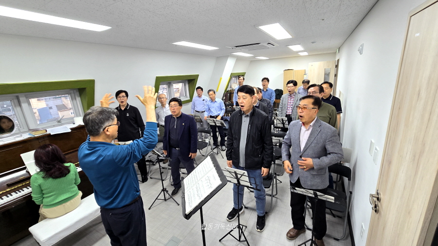 서울강남노회 장로찬양단이 기도로 연습을 시작한다