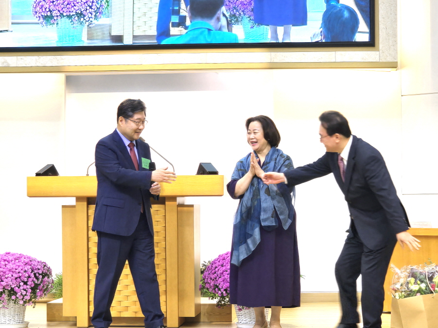 ▲ 축하객 김한성 목사는 “큰 잔치를 열자고 제안했으나, 낙선한 목사님도 계시는데 자제하자고 해서 순종했다”고 밝혔다. 그러면서 노벨문학상 수상자 ‘한강’을 언급하면서 “전쟁으로 사람들이 죽어 나가는데, 잔치할 수 없다”는 뜻도 헤아렸다면서 준비한 꽃다발을 부부에게 선사했다.