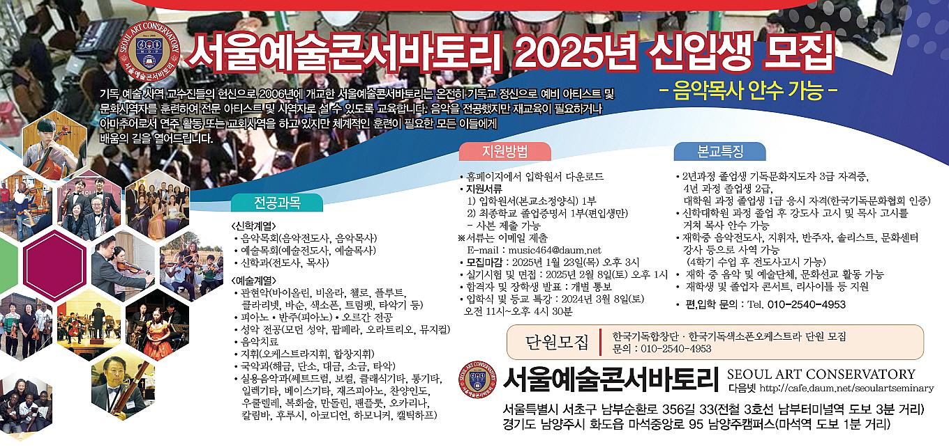 서울예술콘서바토리 2024년 신입생 모집 -음악목사 안수 가능- 기사입력 2024.12.26 19:56 댓글 0 <저작권자ⓒ합동기독신문 & www.ikidok.com 무단전재-재배포금지. > BEST 뉴스 〈최성관의 수다-위기의 ( ·지동빈 장로와 김미희 권사의 아들 지민섭 군과 신지윤 양의 결혼식이 4월 18일 정 ·충청노회 제154회 봄 정기회, 노회장 조광현 목사 “노회와 총회는 법과 절차대로” ·동수원노회 제43회 봄 정기회, 노회장 김철승 목사 선출, 제111회 총회총무 후보 박 ·서강노회 제89회 봄 정기회, 노회장 김성은 목사 선출, 이은철 목사 제111회 총회정 ·광주서광교회 고광석 목사와 송윤선 사모의 딸 ‘아라’ 양과 ‘Andrew’의 결혼식 ·함동노회 봄 정기회, 노회장 오에녹 목사, 여성강도사 관련 헌법 수의에 대한 안건 위로 목록 댓글 작성을 위해 로그인 해주세요. 등록