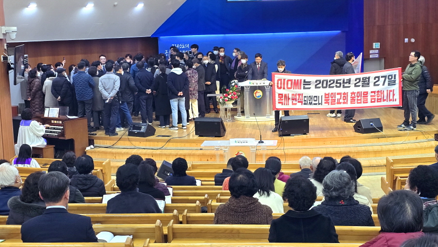 경찰들이 출동한 상태였다. 총회특별재판국 판결문을 놓고서 서로 대치했다. 예배는 부목사의 인도로 진행됐고, 찬양대도 자신들의 의무를 다했지만 1년 만에 찬양대원들의 숫자가 반으로 줄었다. 2024년 4월 21일 주일예배 숫자는 600명에 가까웠지만 이날은 350여 명 수준이다.