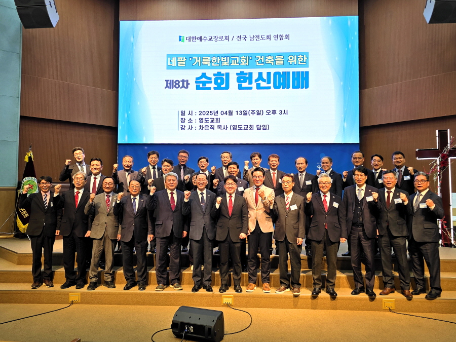 “땅끝까지 이르러 내 증인이 되리라”(행1:8) 제44회 전국남전도회연합회(회장 배원식 장로)는 『네팔, 거룩한빛교회 건축을 위한 제8차 순회헌신예배』를 4월 13일 오후 3시 경기도 성남 영도교회(차은직 목사)에서 열고, 혈과 육의 싸움이 아닌 사탄과의 영적인 싸움을 계속해 나가기로 다짐했다.
