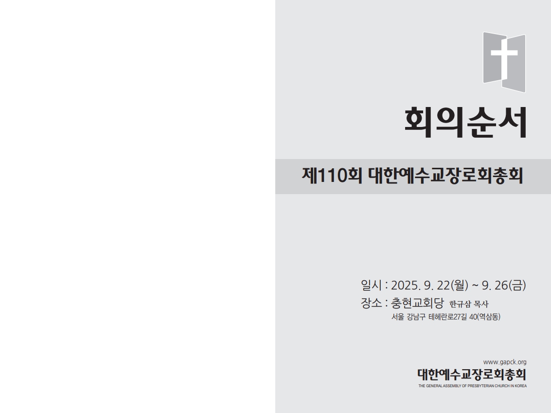 예장합동 제110회 총회 회의순서가 나왔다(8월 22일 기준). 제110회 총회는 9월 22일(월) 오후 2시 개회예배를 시작으로 26일(금) 정오 12시 폐회예배를 드리고 파회한다.