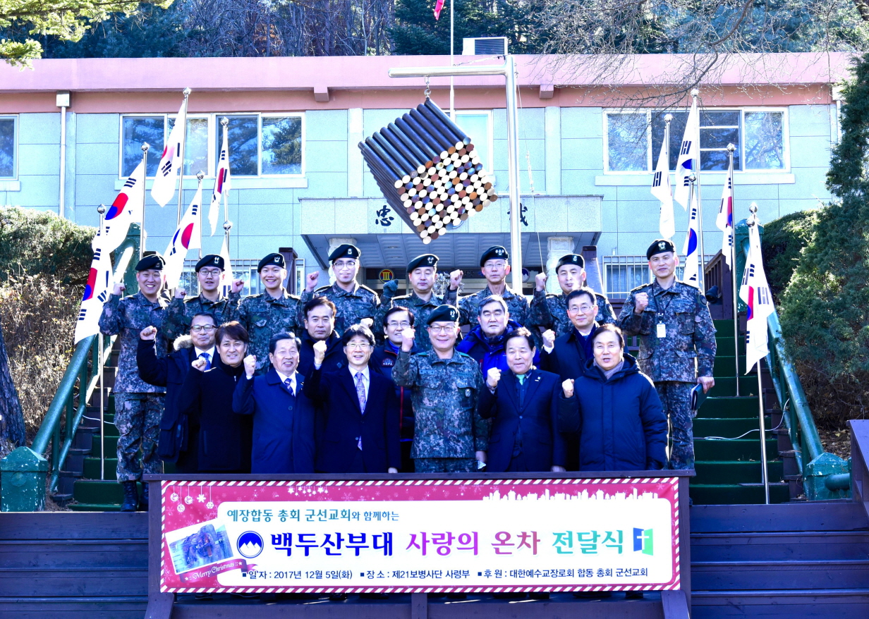 백두산부대는 강원도 양구 동부전선 GOP사단이다. 험준한 산악지대로 가장 길고 넓은 지역의 철책선을 담당하고 있다. 장병들은 한 겨울에 영하 20C 이상 춥고 세찬 바람을 견뎌야 한다. 그 세찬 바람도 잠시 멈추게 할 요량으로 총회 군선교회는 해마다 온 차와 핫 팩을 전달하고 있다. 12월 5일(화) 추운 날씨에도 불구하고 총회군선교회 북부지회(회장 임흥옥 목사)가 부대를 방문하여 온 차와 핫팩을 전달했다.