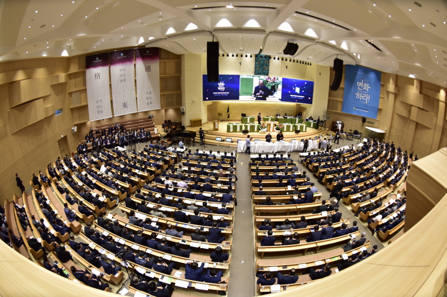 品-품격 있는 총회, 來-꿈이 있는 총회, 通-소통하는 총회. “변화하라! 교회와 민족의 희망으로” 제103회 총회가 9월 10일 오후 2시 대구 반야월교회(이승희 목사)에서 개최됐다. 이번에 참석하는 국내 노회는 153개 노회와 합병하는 (가)전남제일노회 그리고 해외노회는 미주동부노회, 미주서부노회, 뉴질랜드노회로서 모두 157개 노회이다. 이 중에서 천서제한을 받고 회의록에서 총대 명단이 삭제된 노회는 경기북노회, 경상노회, 삼산노회, 중부노회 총4개 노회이다. 총회장 밖에서는 제103 총회를 향해 많은 주장들은 “죄 없는 중부노회를 살려달라” “여성 인재 다 떠난다. 여성 안수 허락하라” “NPA를 저지해 달라” “김영우 총장과 재단이사들이 온전히 순응할 때까지 기도해 달라”였다.