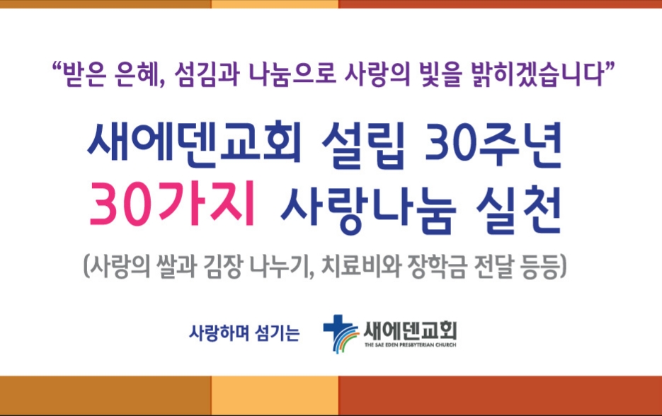 올해로 설립 30주년을 맞는 새에덴교회(담임목사 소강석)가 ‘받은 은혜, 섬김과 나눔으로”라는 주제로 오는 9일(금) 오전 11시, 경기도 시각장애인들에게 사랑의 쌀 나누기와 취약계층에게 김장 나누기 행사를 시작으로 복지시설, 결손가정, 중증환자, 신학교, 미자립교회, 교계 기관 지원 등 30여 가지 사랑나눔 섬김 사역을 진행한다. 그리고 11일 주일 저녁 7시에는 교계와 단체 지도자들, 성도 등 5천여 명이 참석한 가운데 설립 30주년 감사예배와 사랑나눔 전달식을 가진다.